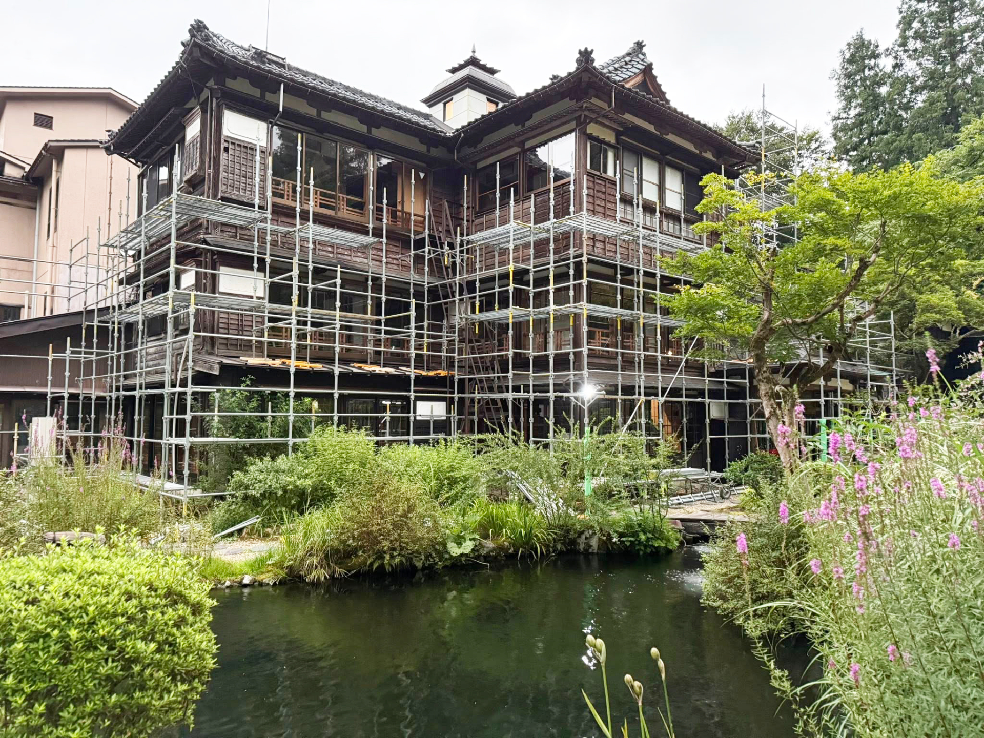 昭和初期の料亭を移築した本館「緑風館」、大きな1枚窓から渓流美を臨む「渓流館」、山手に面した少人数様向け木造平屋「翠悠館」。